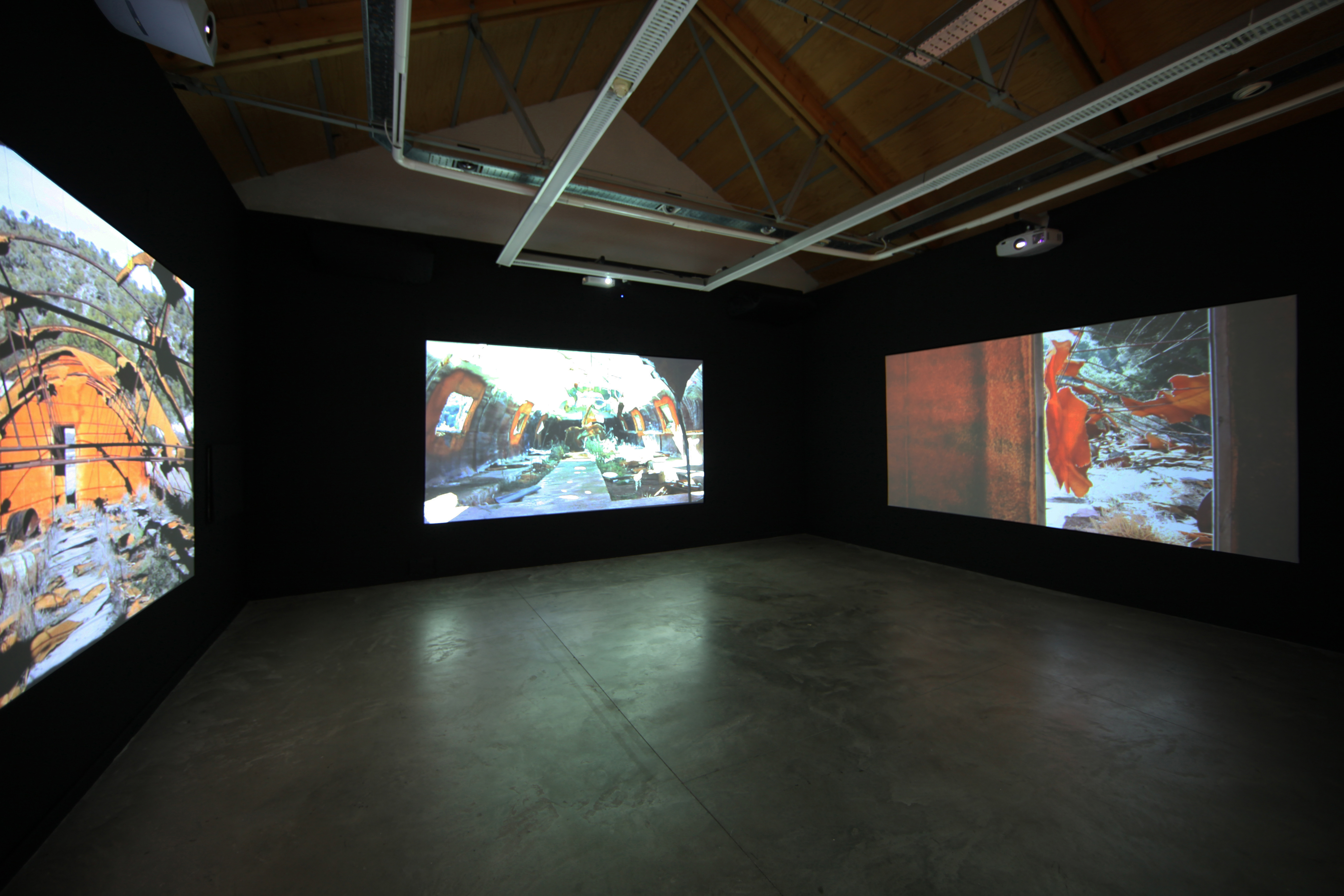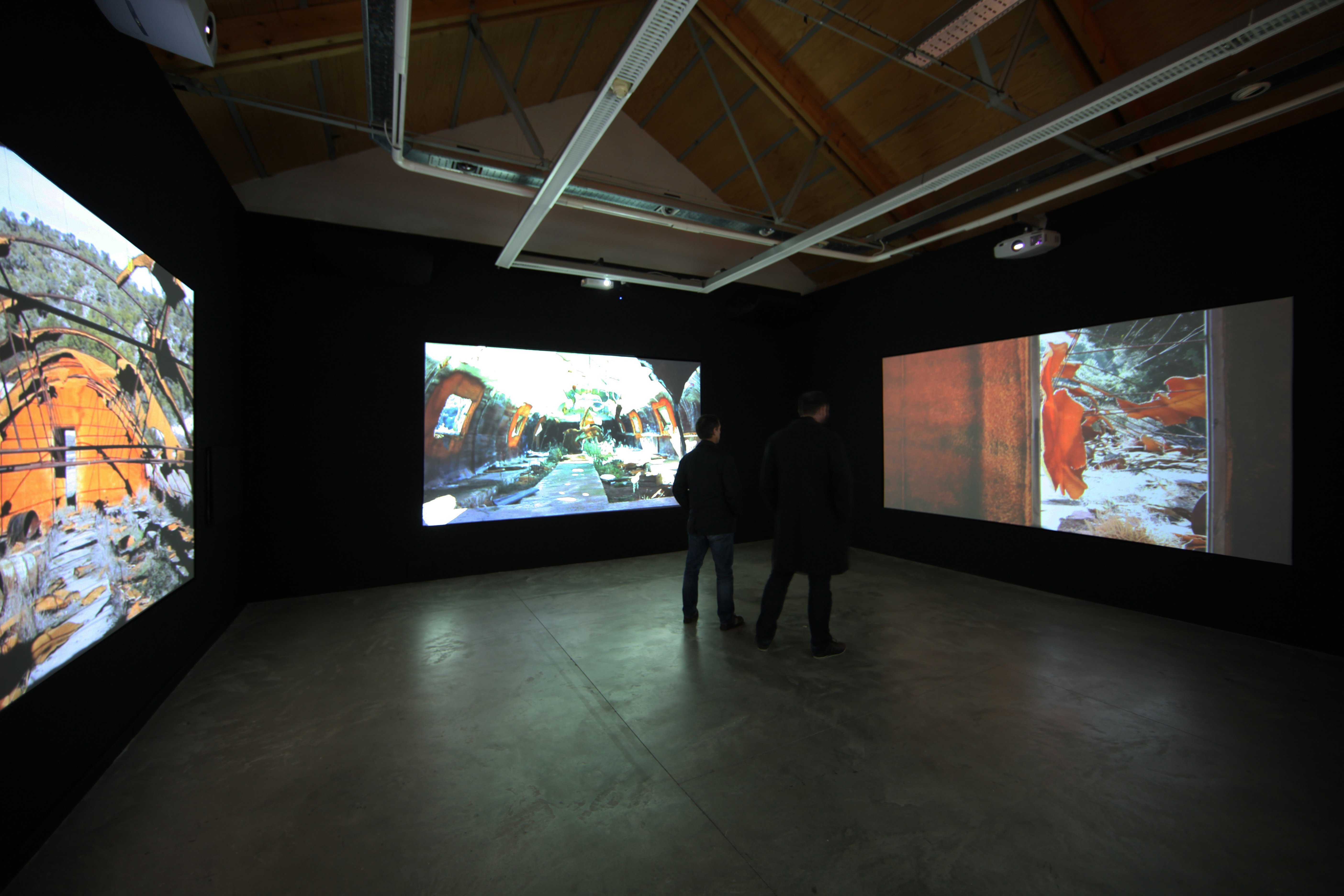 Video instalación compuesta por4 grandes proyecciones sobre pared que crean un espacio cerrado y cuadrado