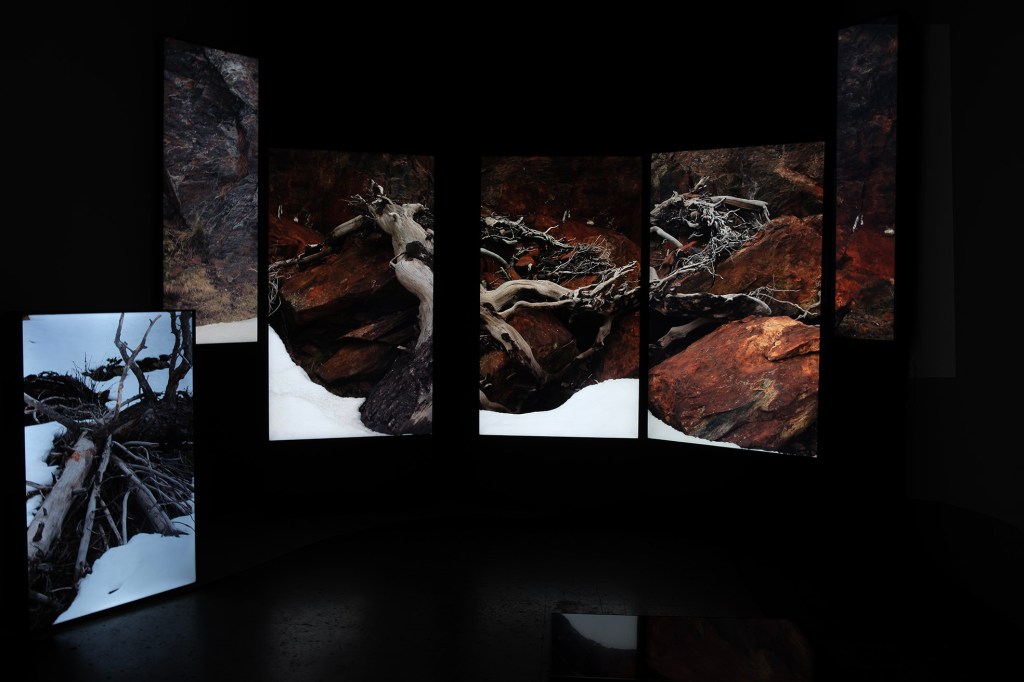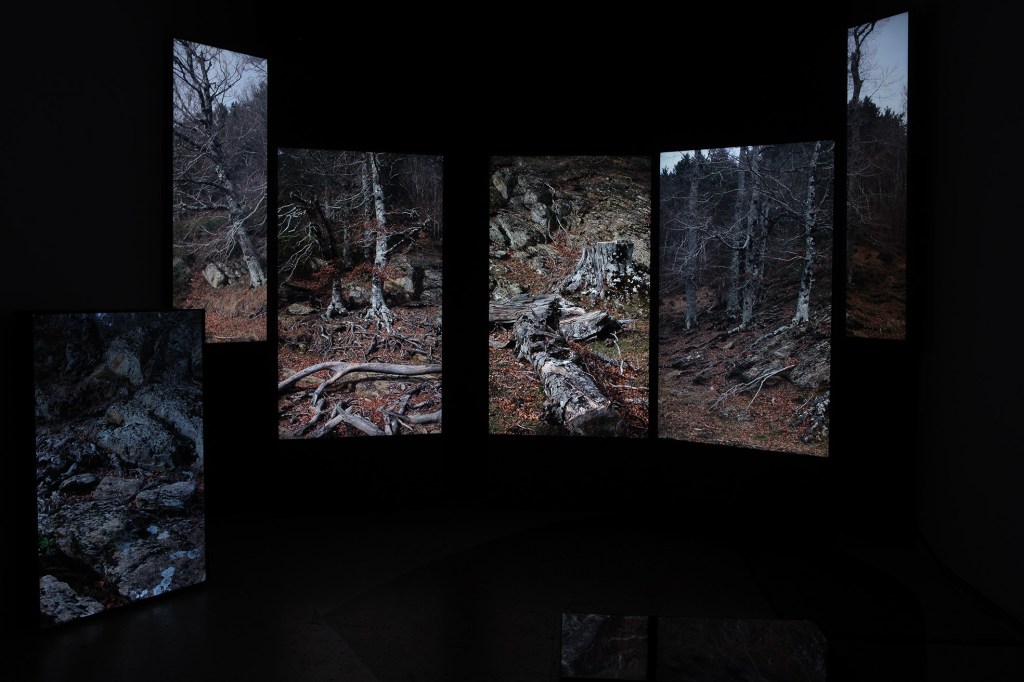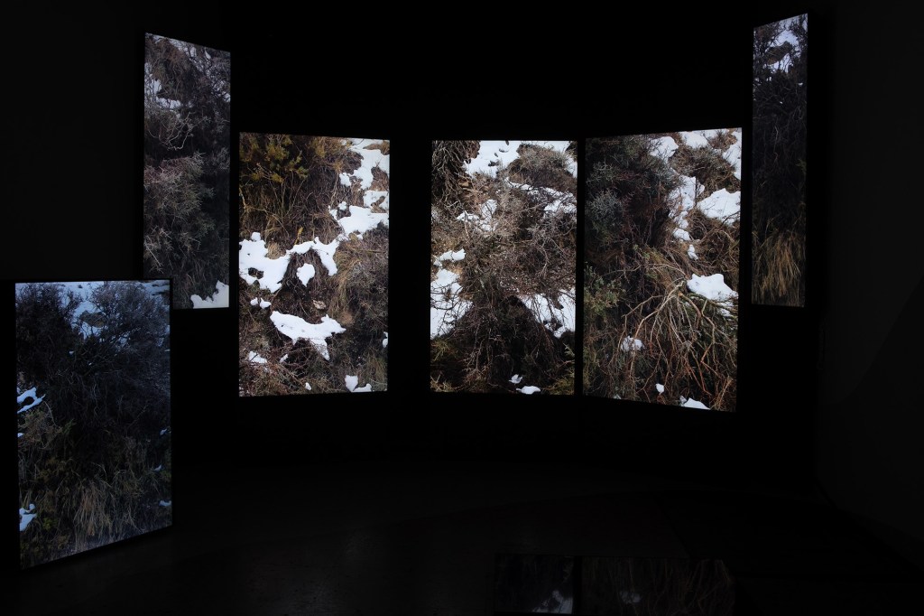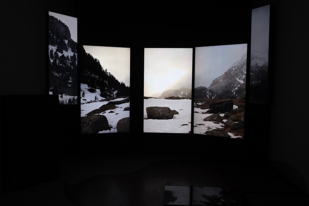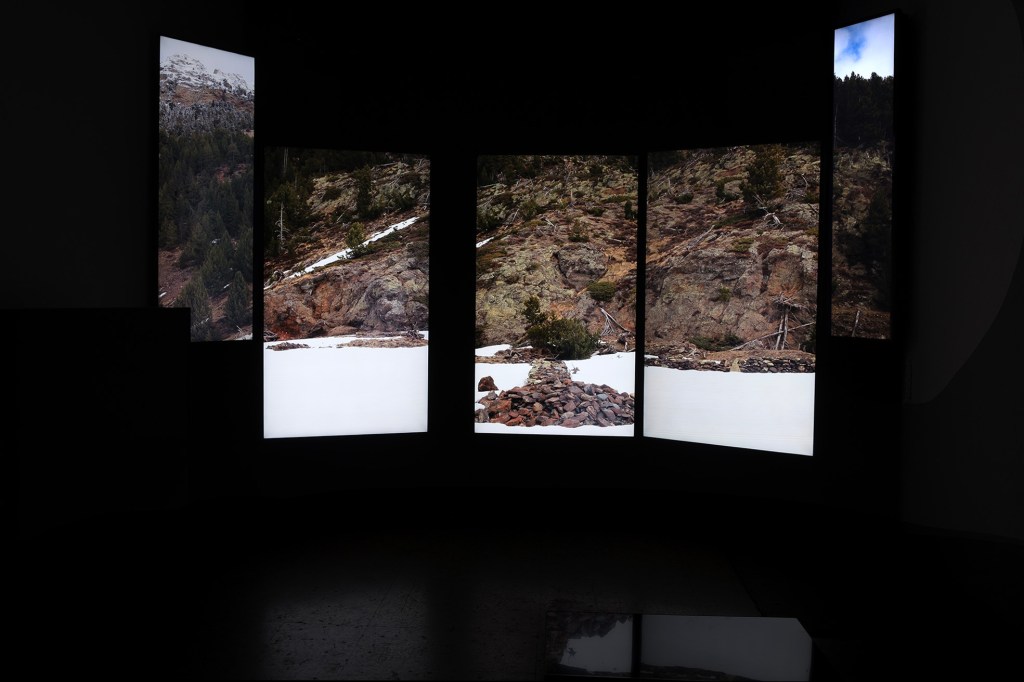 En esta pieza coinciden dos aspectos que de forma rizomática se superponen y se alimentan. Por un lado lo que Sabine Hänsgen (2011) llama la “estética de las imágenes fijas”, una sensación de pausa construida desde la utilización de secuencias largas, de un movimiento mínimo tanto interno como de cámara, de silencios repetidos y de congelaciones en la representación del espacio al que nos vemos convocados desde las diferentes pantallas. Y por otro, el estancamiento musical que, como explica Benet Casablancas en Paisajes del romanticismo musical (2020), se descubre como un mecanismo para incrementar la tensión discursiva y que el oyente percibe como un obstáculo de ese flujo discursivo. Los no lugares que Paco Algaba describe en su texto visual se tornan en esos obstáculos que tensan y destensan el ritmo, intercalando espacios vacíos con espacios simbólicos. Las pantallas actúan presas de ese ritmo oculto dirigido por los cinco movimientos que discurren en los casi 80’. La pieza arranca con Regreso a Barentsburgm, donde encontramos esos espacios de la lejanía que se introducen a modo de estancamiento o de extrañamiento por pura desubicación, para seguir con De árboles y del nacimiento de la montaña, donde se ubica la ley que nos acoge, El refugio como la casa que deviene de la ley de la montaña, Tan sólo es obediencia, inherente a la vida y para cerrar Montañas nevadas, buscando lo extraordinario en lo ordinario.