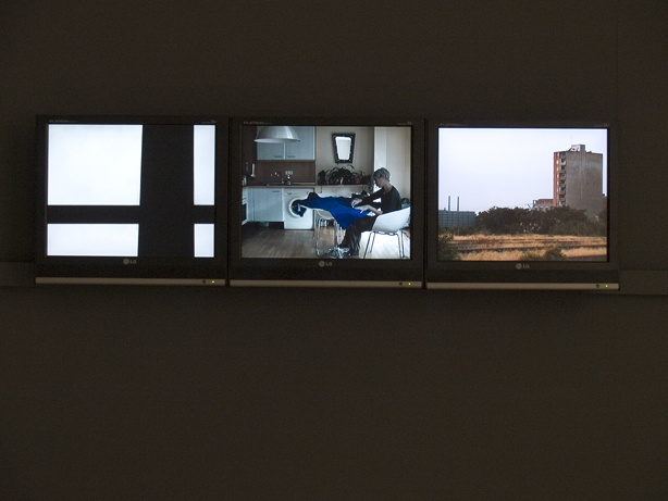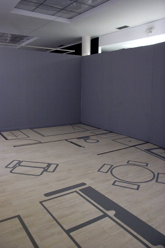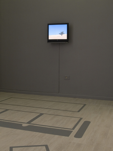 1 video instalación con plano de apartamento de 27 metros cuadrado marcado en el suelo a escala 1:1. Monitor de 21 pulgadas